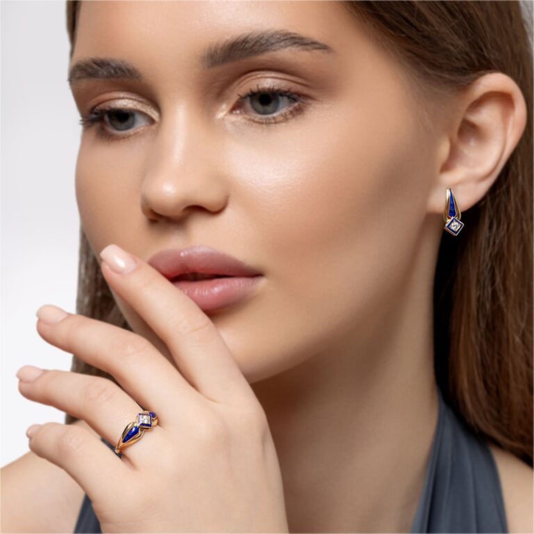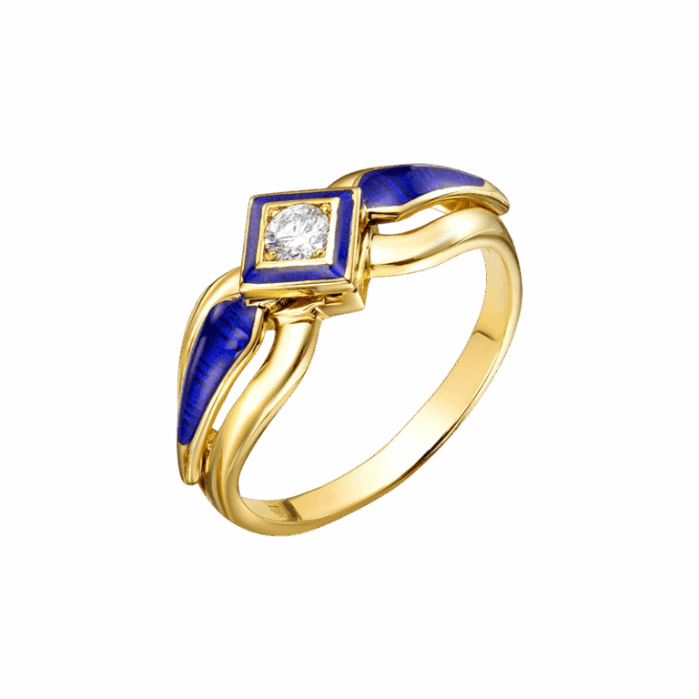 Серьги Капли из желтого золота 585 пробы с бриллиантами и синей горячей эмалью
