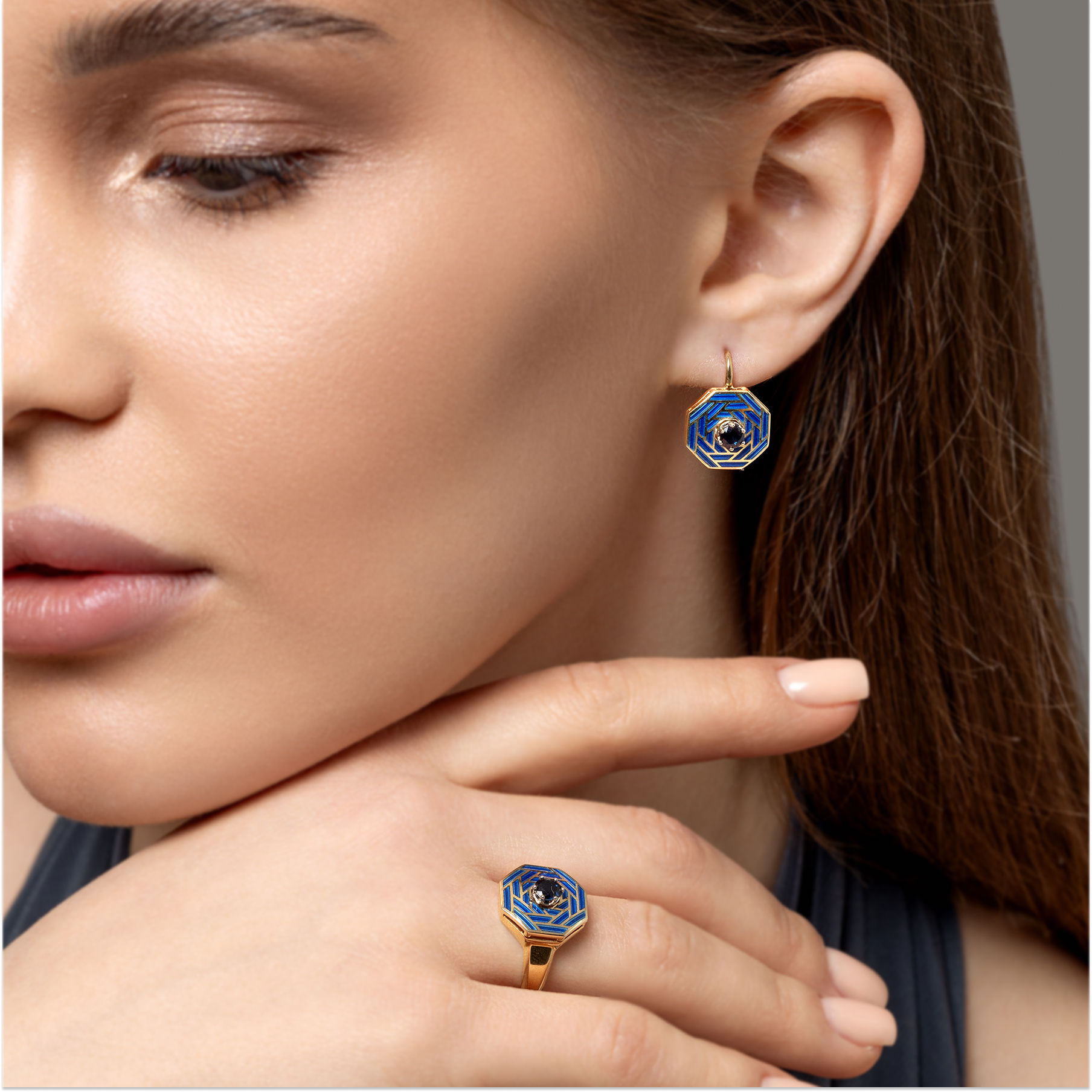 Серьги Тоннель из желтого золота 585 пробы с бриллиантами и зеленой эмалью