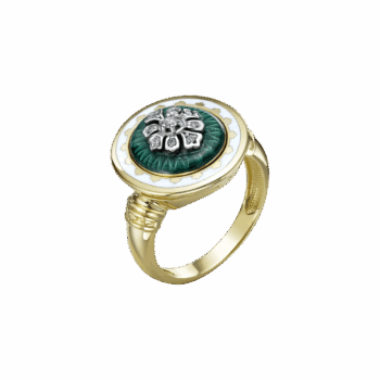 Эффектное кольцо из желтого золота, вдохновленное духом Российской империи. Удивительно лаконично сочетает в себе вставку из белого золота с бриллиантами; сложный гильош, виднеющийся под зеленой эмалью и белую плотную эмаль в окантовке.