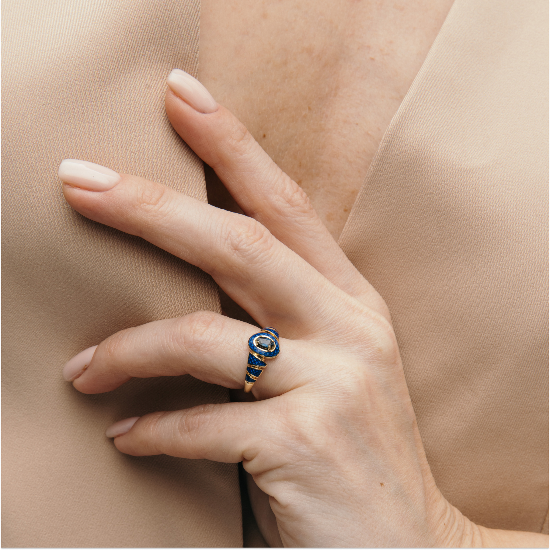 Кольцо Пирамида из желтого золота 585 пробы с сапфиром и горячей эмалью