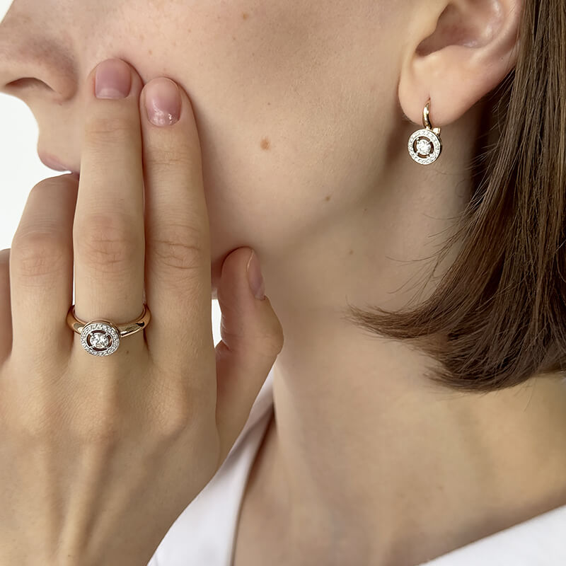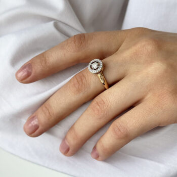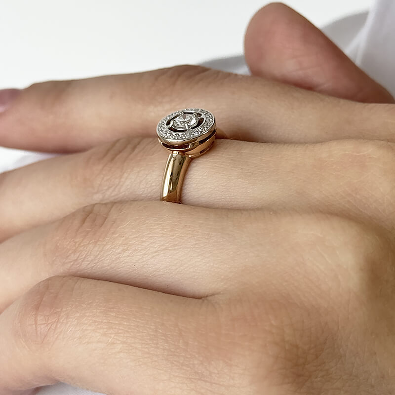 Лаконичное кольцо, выполненное в желтом золоте с крупным бриллиантом весом 0,2 карата и вставкой из белого золота, обсыпанной блиллиантами общим весом 0,074 карата. Все камни высшей категории