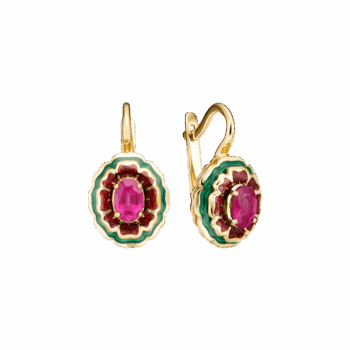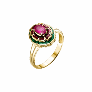Кольцо, вдохновленное природной красотой. Теплое, яркое и элегантное. Выполнено из желтого золота с применением техники горячая эмаль. Овальный рубин весом 0,48 карат подчеркивается красной эмалью в тон камня, а дополнительный кант из зеленой эмали делает кольцо невероятно интересным.