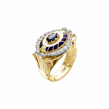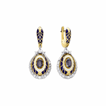 Невероятно торжественные, сложные серьги, вдохновленные эпохой Екатерининской империи. Сочетают в себе желтое и белое золото, бриллианты разного размера, овальные сапфир и эмаль синего и белого цвета, которая подчеркивает и дополняет главный камень.