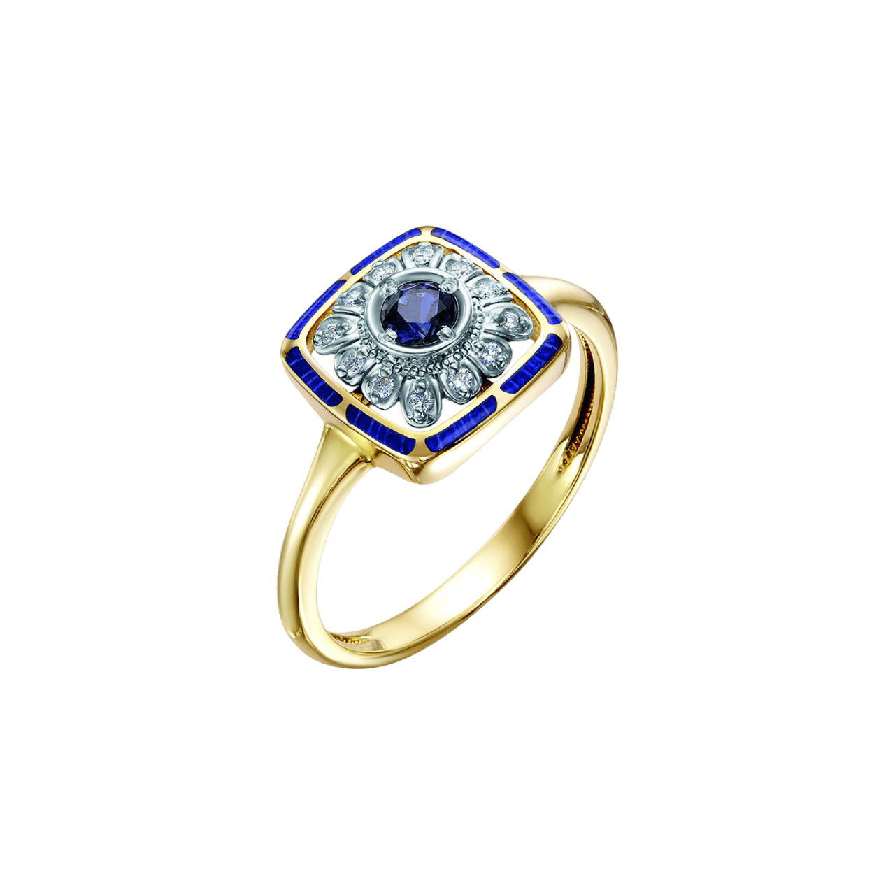 Кольцо Алтея из желтого и белого золота 585 пробы с сапфиром, бриллиантами и синей горячей эмалью