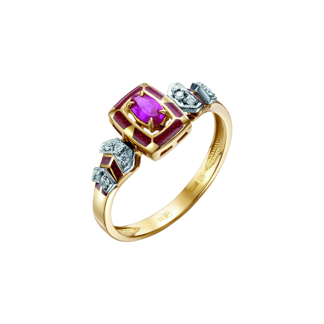 Кольцо из желтого и белого золота, выполненное в технике горячая эмаль с овальным рубином весом 0,28 карат и бриллиантами общей каратностью0,066 карат