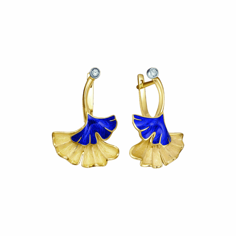 Кольцо Гинкго из желтого золота 585 пробы с синей горячей эмалью