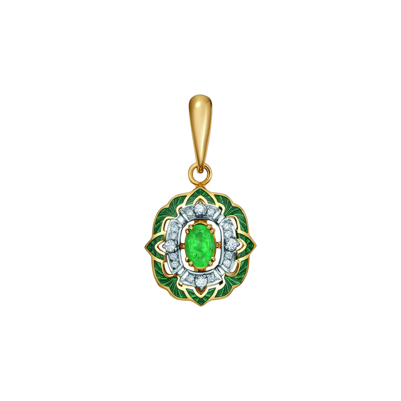 Подвеска из желтого золота, выполненная в технике горячая эмаль с овальным изумрудом весом 0,38 карат и бриллиантами общим весом 0,101 карат