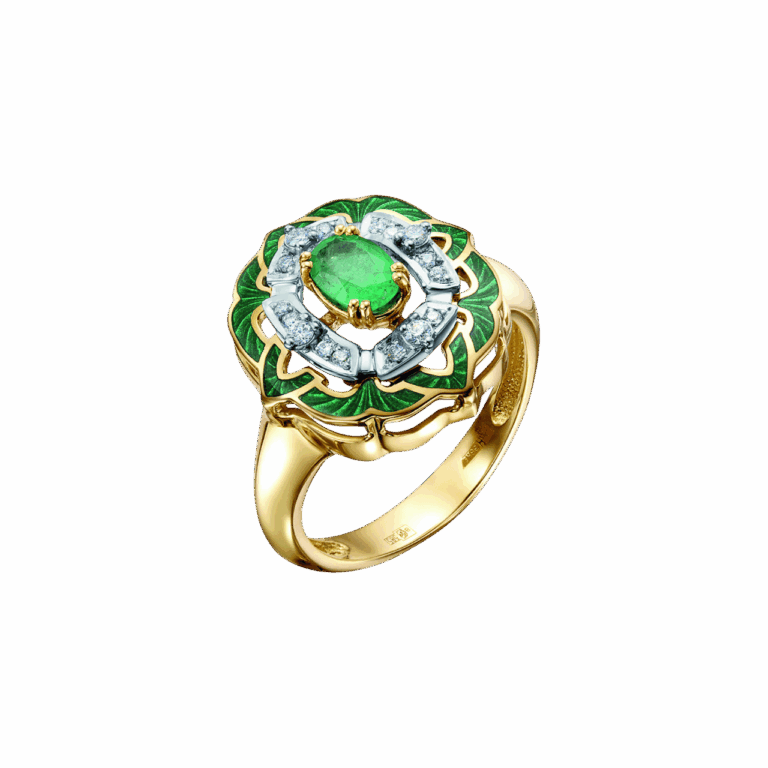 Серьги из желтого золота 585 пробы, выполненные в технике горячая эмаль с овальными изумрудами общим весом 0,86 карат и бриллиантами общим весом 0,197 карат