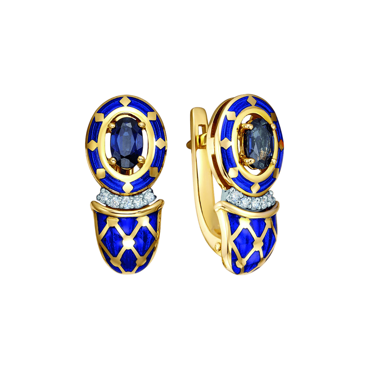 Серьги из желтого золота, выполненные в технике горячая эмаль с овальными сапфирами общим весом 0,57 карат и бриллиантами общим весом 0,041 карат